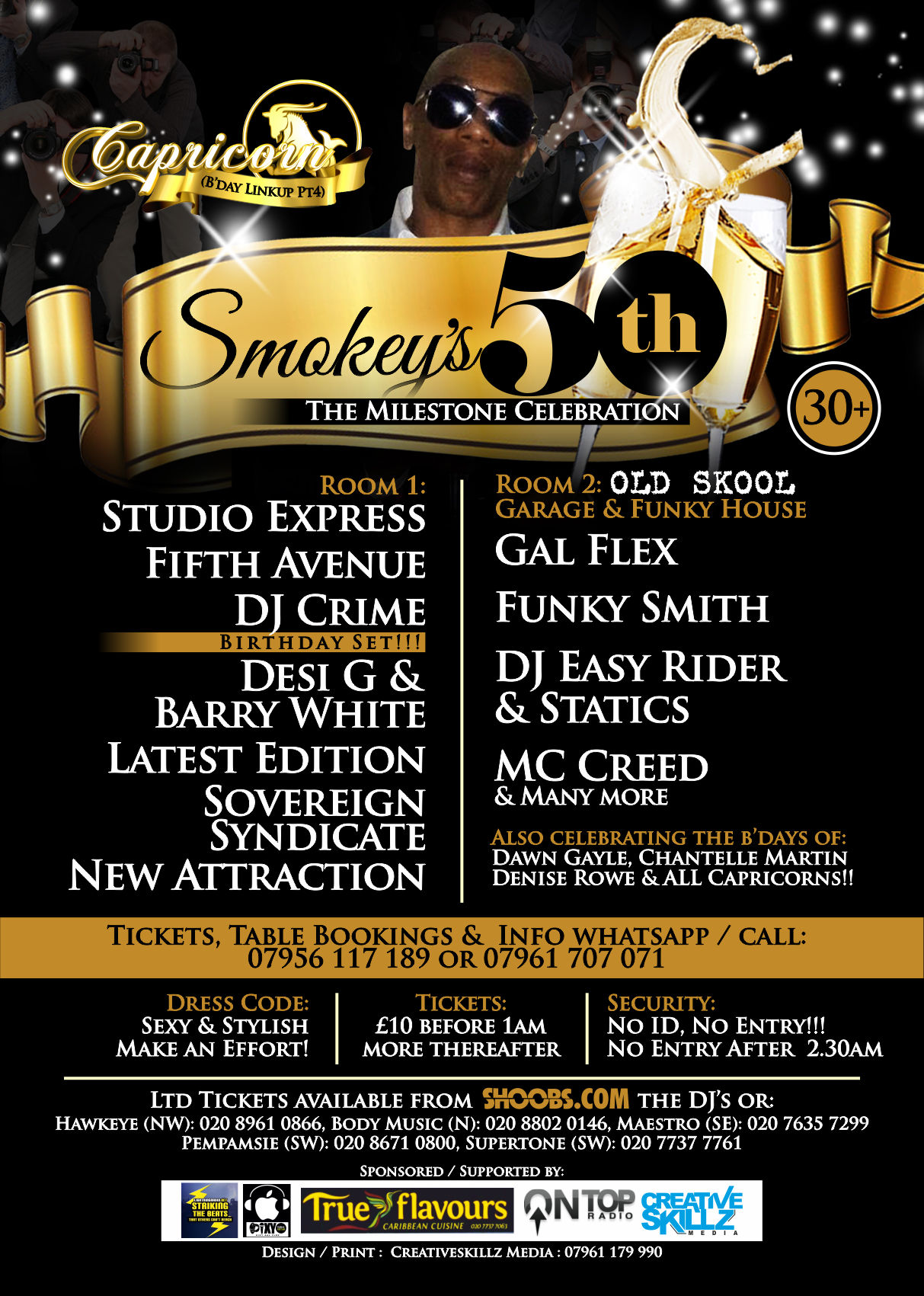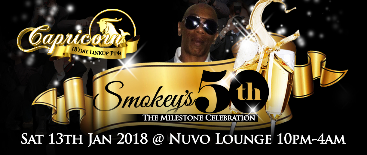 The milestone 50th birthday celebration for Smokey and ALL Capricorns Also Celebrating the birthdays of: Dixy (Gal Flex) DJ Crime Slim (The Comedian) Music Policy: RnB / Bashment / Hip-Hop / A...